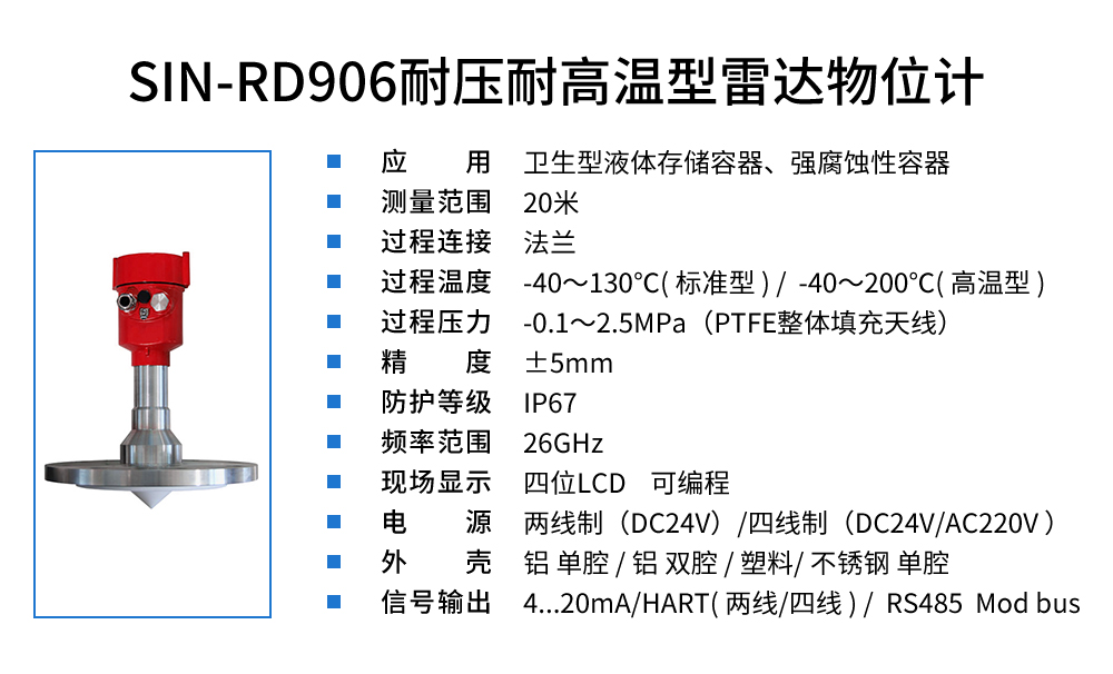 聯測SIN-RD906雷達液位計,適用于衛生型液體存儲容器。雷達液位計天線發射及窄的微波脈沖,這個脈沖以光速在空間傳播,遇到被測介質表面,其部分能量被反射回來,被同一天線接收。發射脈沖與接收脈沖的時間間隔與天線到被測介質表面的距離成正比,多用于水位、料位與化工場合。