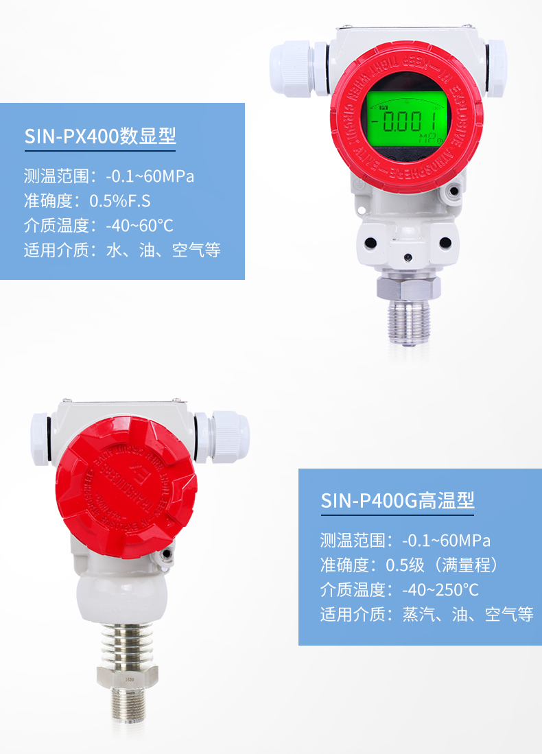 聯測_SIN-P400_2088型壓力變送器_精度0.5%榔頭型_可帶顯示 P400全數字電路保證精度,保證長期零點和線性穩定,現場液晶顯示,多種量程選擇,防雷擊,防射頻干擾,液晶顯示可通過按鍵調整零點和量程,方便用戶調試。